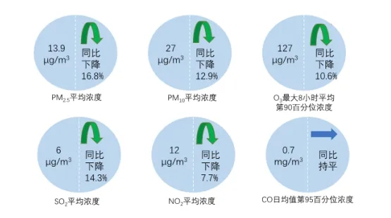 8月,全国339个地级及以上城市PM2.5平均浓度为13.9微克/立方米,同比下降16.8%;PM10平均浓度为27微克/立方米,同比下降12.9%;O3平均浓度为127微克/立方米,同比下降10.6%;SO2平均浓度为6微克/立方米,同比下降14.3%;NO2平均浓度为12微克/立方米,同比下降7.7%;CO平均浓度为0.7毫克/立方米,同比持平。8月,全国339个地级及以上城市平均空气质量优良天数比例为96.0%,同比上升5.9个百分点;平均重度及以上污染天数比例为0.2%,同比持平。由沙尘天气导致的平均超标天数比例为0.6%,其中重度及以上污染天数比例为0.2%。